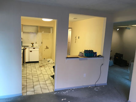 Complete kitchen remodel, view opening to living area, new flooring, lighting, cabinets and countertops, and backsplash.